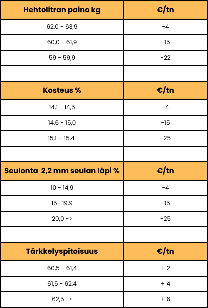 The quality of barley effects to basic price accordingly. This quality based pricing is valit from 1st of December 2023.